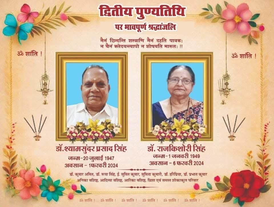 लखीसराय। जिले के चिकित्सा जगत के लिए आज का दिन भावुक स्मृतियों से भरा रहा। शहर की सुप्रसिद्ध चिकित्सक डॉ. राजकिशोरी जी और उनके पति डॉ. श्यामसुन्दर सिंह की दूसरी पुण्यतिथि पर लोगों ने नम आंखों से उन्हें याद किया। संयोग ही कहा जाएगा कि दो वर्ष पूर्व दोनों पति-पत्नी का निधन महज एक सप्ताह के अंतराल में हो गया था, जिसने पूरे शहर को गहरे शोक में डुबो दिया था।
