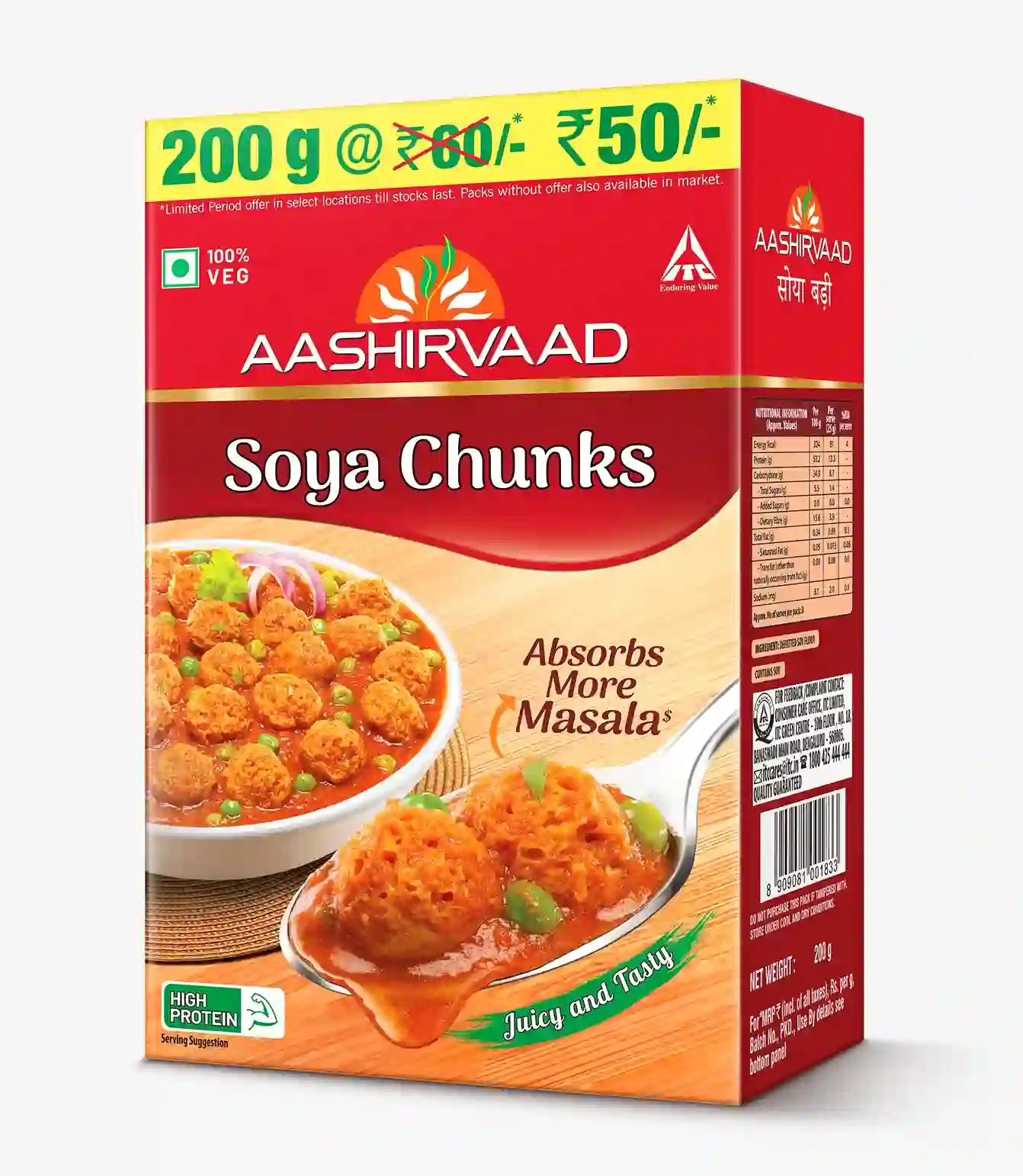 सामान्य सोया स्वाद मे कम और चबाने में कठिन होते हैं, वहीं इसके ठीक उलट आशीर्वाद सोया चंक्स की अनूठी छिद्रपूर्ण संरचना होती है, जिससे मसाला इनमें अच्छे से रच जाता है और हरेक निवाले में रसदार और भरपूर स्वाद आता है। आप चाहे करी बनाएं, बिरयानी या फिर शाम का कोई नाश्ता, इन चंक्स की बदौलत परिणाम हमेशा स्वादिष्ट और रसदार मिलेगा। इसके अलावा, आशीर्वाद सोया चंक्स के प्रति 100 ग्राम में ~53 ग्राम प्रोटीन होता है। यह उबले हुए अंडों (~13 ग्राम/100 ग्राम) में मौजूद प्रोटीन से दोगुना है और पनीर (~18 ग्राम/100 ग्राम) से भी अधिक है। ये फैट-फ्री हैं, कोई प्रिज़र्वेटिव या स्टेबलाइज़र नहीं डाला गया है और प्राकृतिक रूप से कोलेस्ट्रॉल मुक्त हैं। सबसे समृद्ध शाकाहारी प्रोटीन स्रोतों में से एक – आशीर्वाद सोया चंक्स की 1 सर्विंग दैनिक प्रोटीन की ज़रूरतों का ~ 24% प्रदान करेगी।