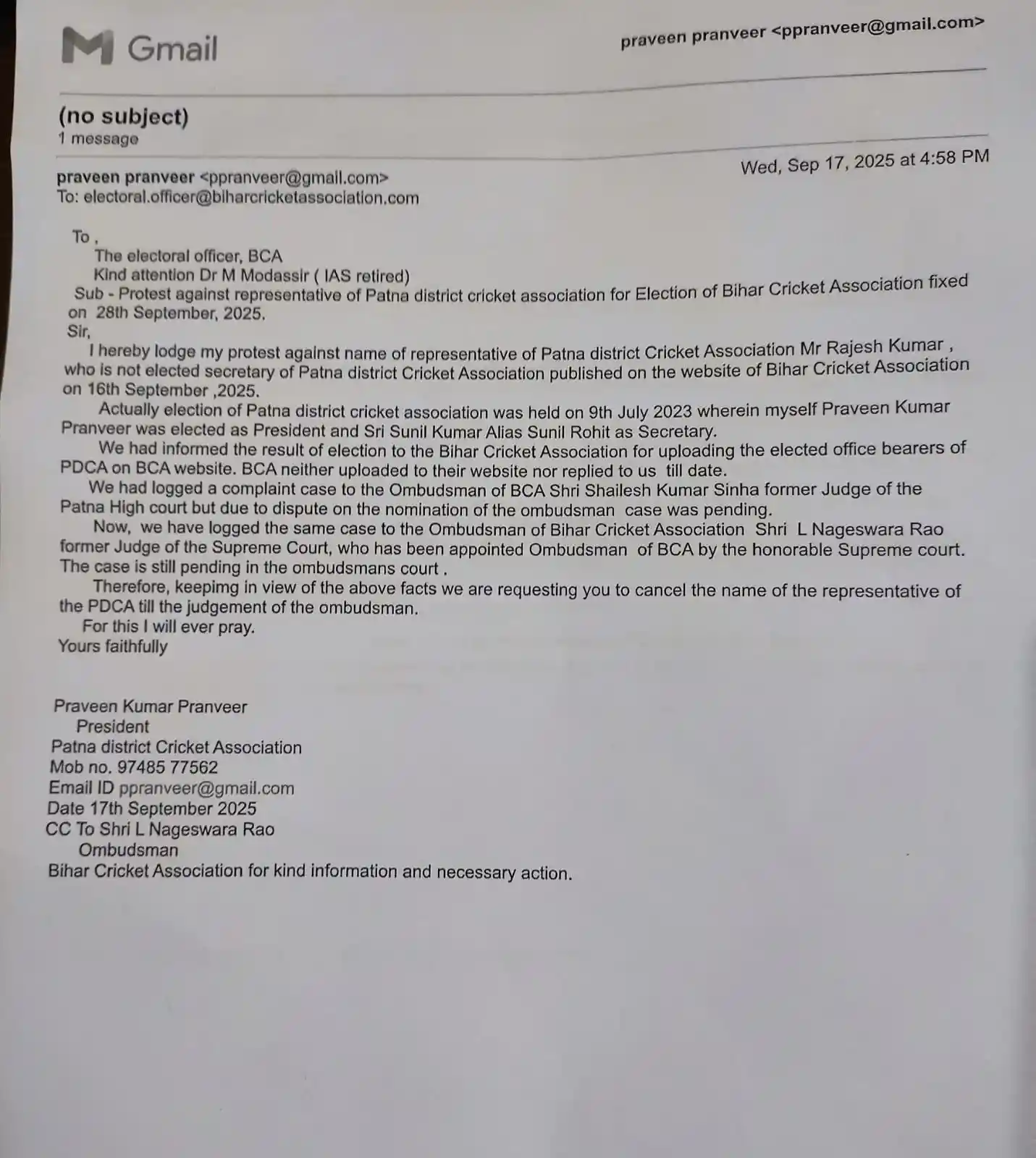 पटना, 16 सितंबर 2025:बिहार क्रिकेट एसोसिएशन (BCA) के चुनाव को लेकर विवाद एक बार फिर गहराता नजर आ रहा है। सारण जिला क्रिकेट संघ के सचिव आदित्य प्रकाश वर्मा ने सोमवार की शाम चुनाव पदाधिकारी के पास एक लिखित आपत्ति दर्ज कराते हुए वोटर लिस्ट पर गंभीर सवाल उठाए हैं।