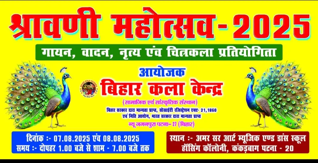 बिहार कला केंद्र के तत्वावधान में आगामी 7 और 8 अगस्त को कंकड़बाग स्थित अमर सर आर्ट, म्यूजिक एंड डांस स्कूल में दो दिवसीय श्रावणी महोत्सव का भव्य आयोजन किया जा रहा है। यह कार्यक्रम प्रतिदिन दोपहर 1:00 बजे से संध्या 7:00 बजे तक आयोजित होगा, जिसमें कला और संस्कृति की विभिन्न विधाओं की प्रतियोगिताएँ होंगी।