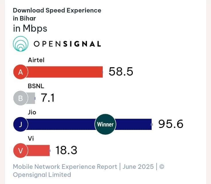 पटना / रांची 06 जून 2025: रिलायंस जियो ने बिहार टेलीकॉम सर्किल में औसत डाउनलोड स्पीड के मामले में एयरटेल, वोडाफोन-आइडिया और बीएसएनएल को एक बार फिर भारी अंतर से मात दी है।