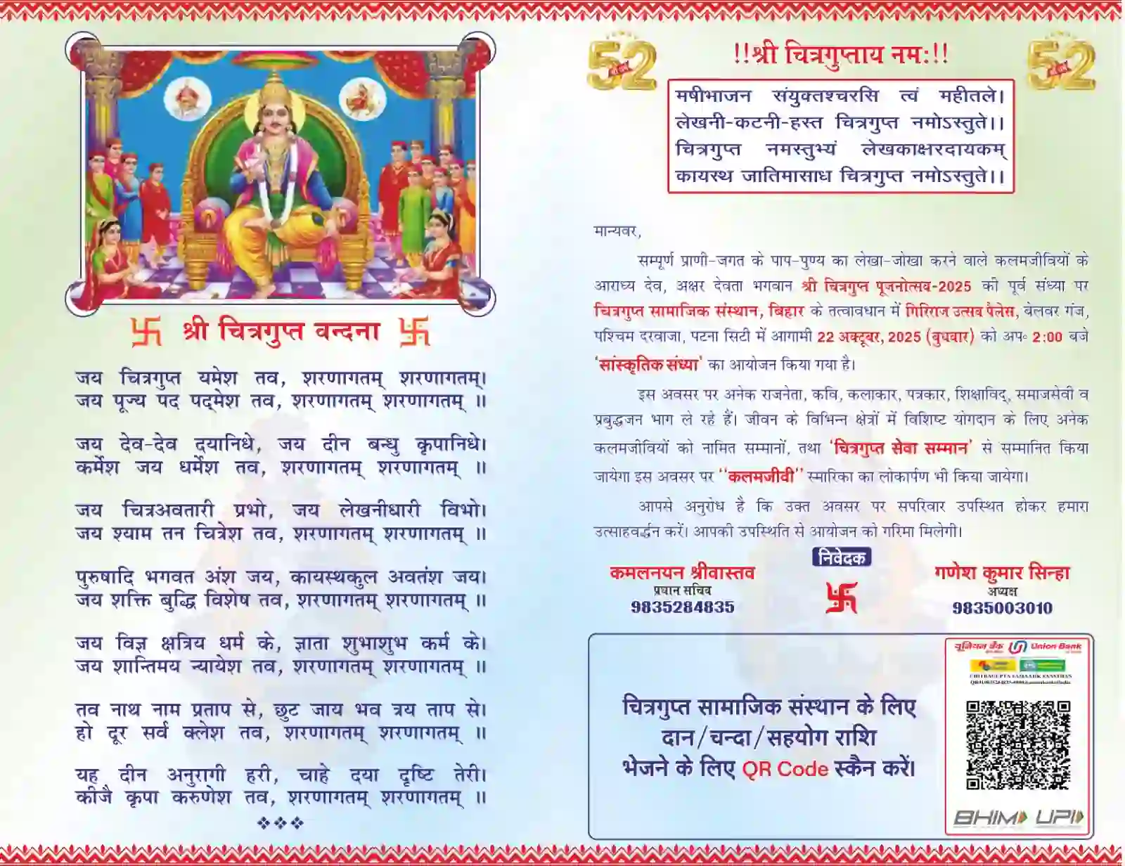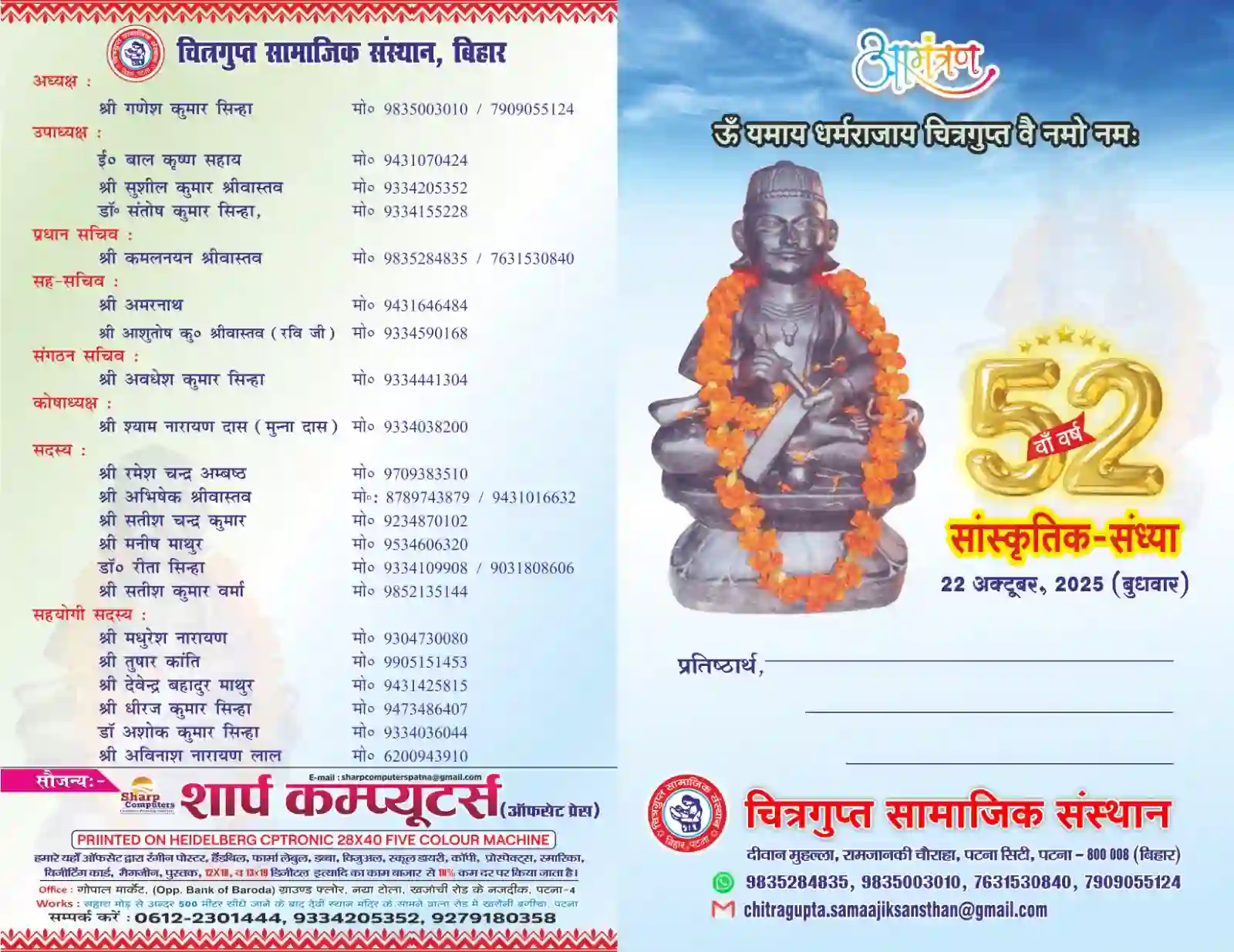 चित्रगुप्त सामाजिक संस्थान के प्रधान सचिव कमलनयन श्रीवास्तव और अध्यक्ष गणेश कुमार सिन्हा ने बताया कि सम्पूर्ण प्राणी-जगत के पाप-पुण्य का लेखा-जोखा करने वाले कलमजीवियों के आराध्य देव, अक्षर देवता भगवान श्री चित्रगुप्त पूजनोत्सव, 2025 की पूर्व संध्या पर चित्रगुप्त सामाजिक संस्थान, बिहार के तत्वावधान में गिरिराज उत्सव पैलेस, बेलवर गंज, पश्चिम दरवाजा, पटना सिटी में आगामी 22 अक्टूबर 2025 (बुधवार को 2:00 बजे ‘सांस्कृतिक संध्या’ का आयोजन किया गया है। उन्होंने बताया कि इस कार्यक्रम में शिरकत करने के लिये पूर्व केन्द्रीय मंत्री एवं सांसद (लोकसभा) रविशंकर प्रसाद,बिहार विधान सभा के अध्यक्ष नन्द किशोर यादव, पूर्व राज्यपाल गंगा प्रसाद, ख्यातिनाम चिकित्सक पद्मश्री डॉ. गोपाल प्रसाद सिन्हा, आरक्षी महानिदेशक आलोक राज, न्यायमूर्ति हेमंत कुमार श्रीवास्तव, न्यायमूर्ति अमरेश कुमार लाल को आमंत्रित किया गया है।