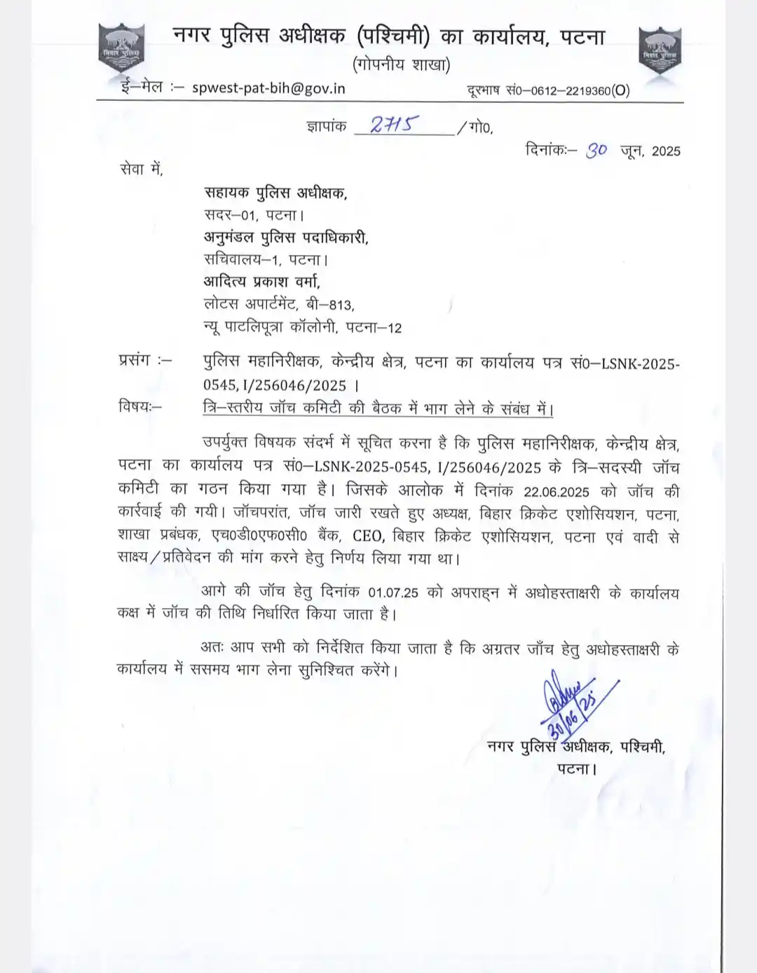 पटना: बिहार के पुलिस महानिदेशक के निर्देश पर पटना प्रक्षेत्र के पुलिस महानिरीक्षक के द्वारा बिहार क्रिकेट संघ के अध्यक्ष सहित अन्य लोगों के खिलाफ पूर्व में दर्ज हुई तीन एफ़आईआर की पुन: जांच की जा रही है। इस जांच के लिए एस पी वेस्ट के अध्यक्षता में गठित तीन सदस्यीय कमिटी का गठन किया गया है। कोतवाली थाना कांड 49/23, एस के पूरी थाना कांड संख्या 337/24 और साइबर थाना कांड संख्या 632/24 में एफ़आईआर दर्ज होने के बाद जांच अधिकारी के द्वारा तीनों एफ़आईआर को फाइनल कर दिया गया था। इन तीनों एफ़आईआर में फाइनल किए जाने के विरुद्ध अदित्या प्रकाश वर्मा ने बिहार के पुलिस महानिदेशक के यहाँ गुहार लगाई और कहा कि हुए जांच में अपराध के साक्ष्य रहने के वावजूद इन मामलों को जांच अधिकारी के द्वारा फाइनल कर दिया गया है अत: इसकी जांच किसी वरीय पदाधिकारी के नेतृत्व में कराने की कृपा की जाय।