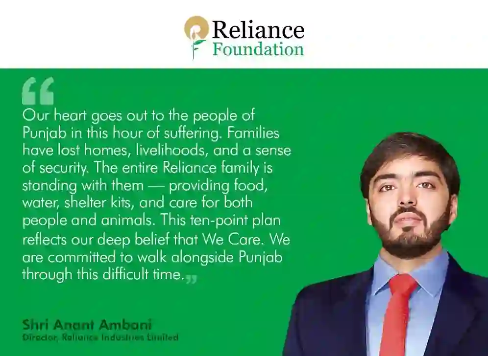 रिलायंस इंडस्ट्रीज लिमिटेड के निदेशक अनंत अंबानी ने कहा “इस दुख की घड़ी में हमारी संवेदनाएँ पंजाब के लोगों के साथ हैं। बहुत से परिवारों ने अपने घर और कारोबार खो दिए हैं। पूरा रिलायंस परिवार आज पजांब के साथ खड़ा है। लोगों के साथ जानवरों के लिए भोजन, पानी और आश्रय का इंतजाम किया जा रहा है। हम राहत की दस-सूत्रीय योजना पर काम कर रहे हैं और इस कठिन समय में हर कदम पंजाब के साथ हैं।“