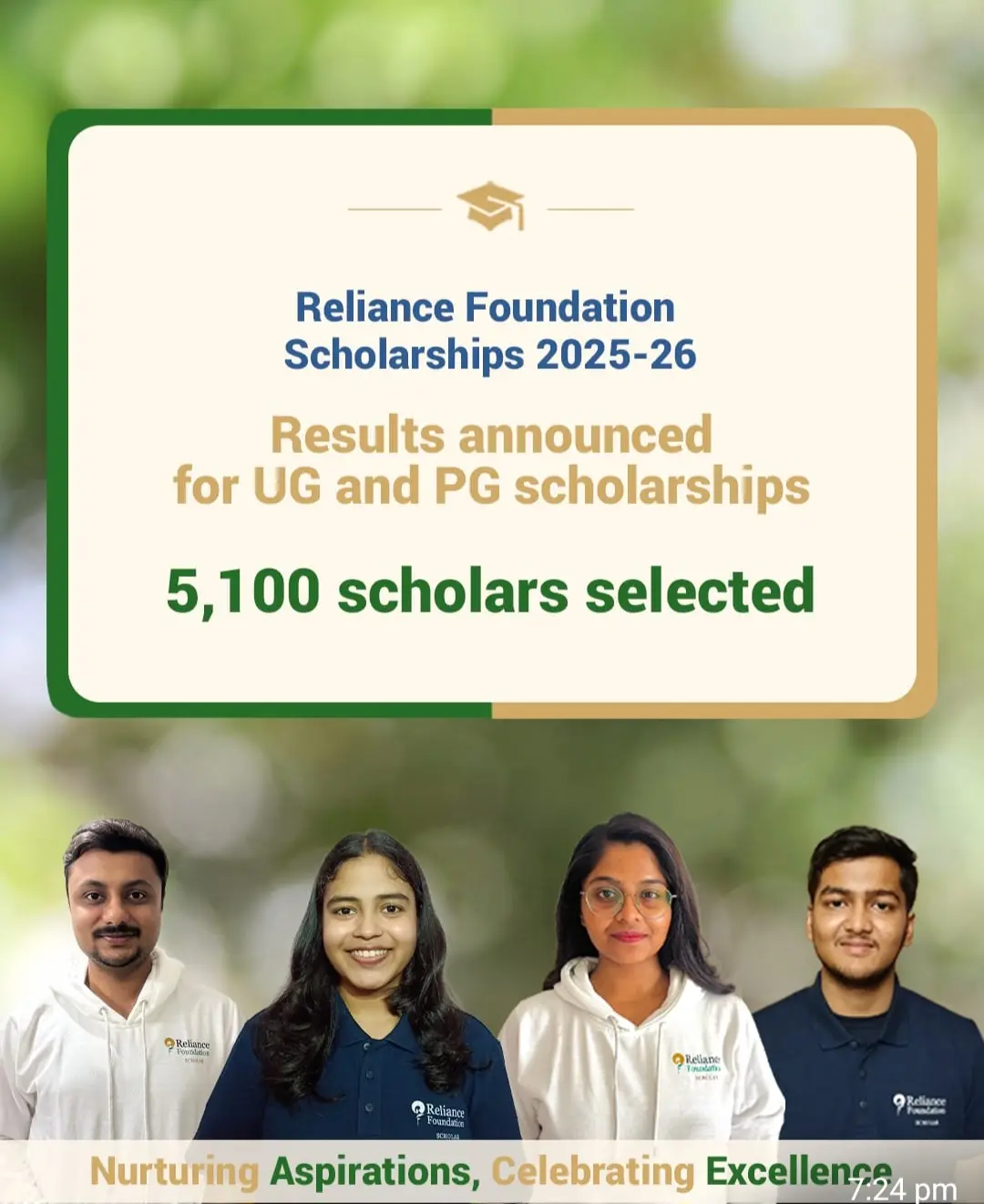रिलायंस फाउंडेशन के प्रवक्ता ने कहा, “भारत के युवाओं में असाधारण प्रतिभा और संकल्प है। हमारी छात्रवृत्तियाँ केवल वित्तीय सहायता तक सीमित नहीं हैं, बल्कि मेंटरशिप, मजबूत पीयर नेटवर्क और नेतृत्व विकास के अवसर भी प्रदान करती हैं। हम नए स्कॉलर्स को पुरानी सीमाएँ तोड़ते हुए बड़े सपने देखने और ‘विकसित भारत’ के लक्ष्य की ओर अग्रसर होने के लिए प्रोत्साहित करते हैं।”