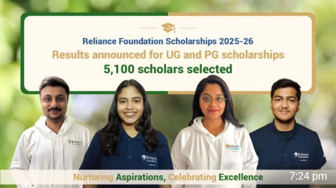 मुंबई, 27 दिसंबर 2025: रिलायंस के संस्थापक एवं अध्यक्ष रहे श्री धीरूभाई अंबानी की 93वीं जयंती की पूर्व संध्या पर रिलायंस फाउंडेशन ने शैक्षणिक वर्ष 2025-26 के लिए अपनी प्रतिष्ठित अंडरग्रेजुएट (UG) और पोस्टग्रेजुएट (PG) स्कॉलरशिप के परिणाम घोषित कर दिए। इस वर्ष देशभर से 5,000 यूजी और 100 पीजी छात्रों का चयन किया गया है।