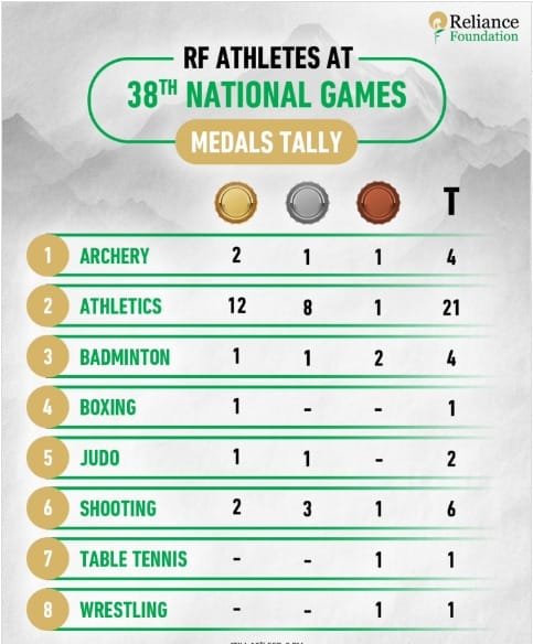 देहरादून, 14 फरवरी, 2025:राष्ट्रीय खेलों में रिलायंस फाउंडेशन के एथलीटों ने शानदार प्रदर्शन करते हुए 43 पदक हासिल किए हैं। इनमें 20 स्वर्ण, 16 रजत और 7 कांस्य पदक शामिल हैं। एथलेटिक्स में रिलायंस फाउंडेशन के एथलीटों ने झंडे गाड़ दिए और कुल 21 पदक अपने नाम किए। 100 मीटर, 200 मीटर और 4×100 मीटर रिले में तीन स्वर्ण पदक जीतकर अनिमेष कुजूर स्टार खिलाड़ी बनकर उभरे।