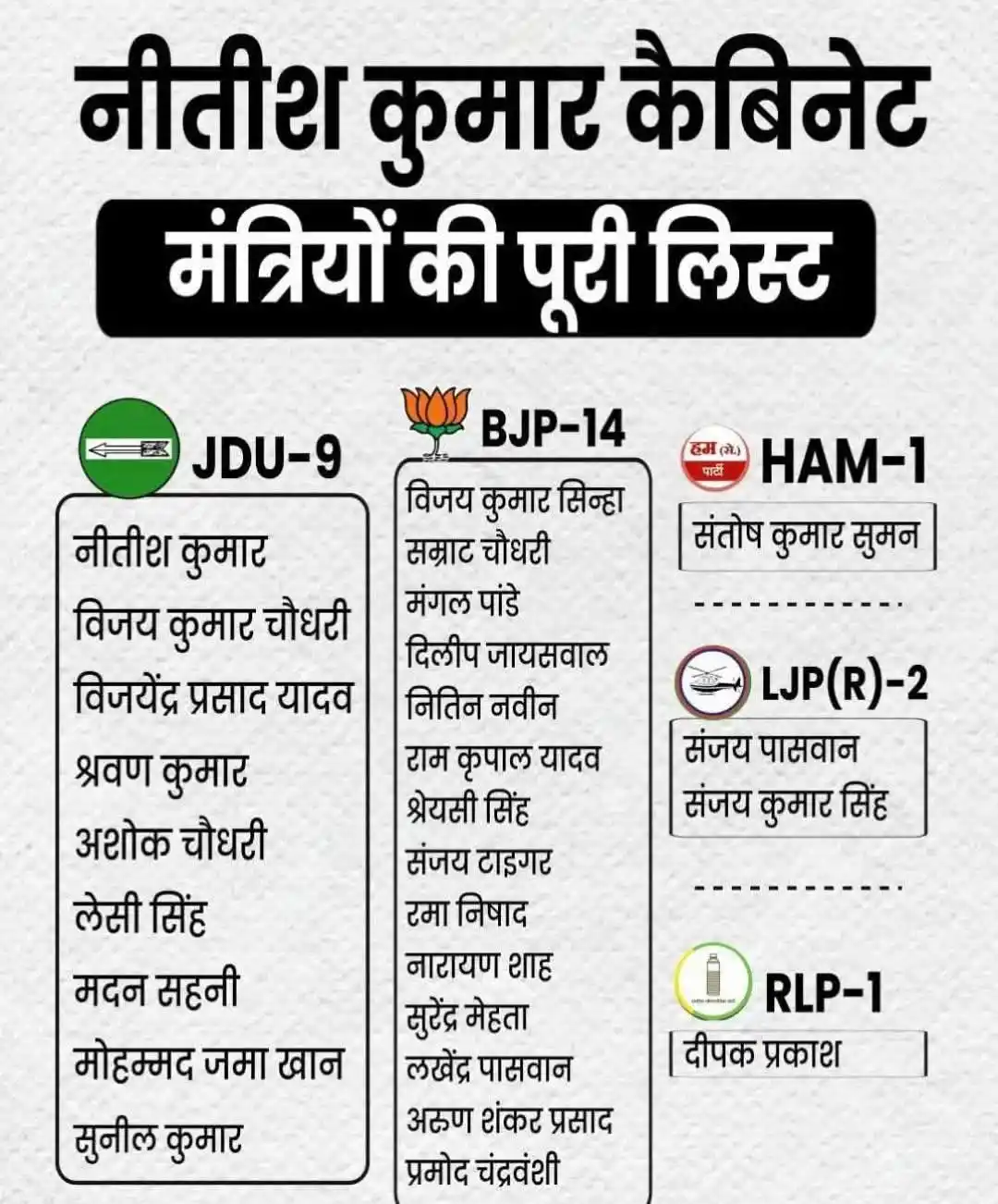 मंत्रियों के रूप में पद एवं गोपनीयता की शपथ लेने वालों में सम्राट चौधरी, विजय कुमार सिन्हा, विजय कुमार चौधरी, बिजेन्द्र प्रसाद यादव, श्रवण कुमार, मंगल पाण्डे, डॉ० दिलीप कुमार जायसवाल, अशोक चौधरी, लेशी सिंह, मदन सहनी, नितिन नवीन, रामकृपाल यादव, संतोष कुमार सुमन, सुनील कुमार, मो० जमा खान, संजय सिंह टाइगर, अरुण शंकर प्रसाद, सुरेंद्र मेहता, श्री नारायण प्रसाद,  रमा निषाद, लखेन्द्र कुमार रौशन, श्रेयसी सिंह, प्रमोद कुमार, संजय कुमार, संजय कुमार सिंह एवं दीपक प्रकाश शामिल हैं।