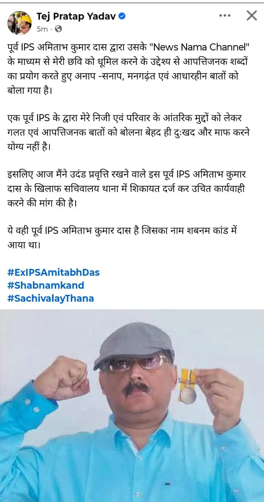 पूर्व मुख्यमंत्री लालू प्रसाद के बड़े पुत्र और पूर्व मंत्री तेजप्रताप यादव ने सोमवार को अपने सोशल मीडिया पर जारी पोस्ट में पूर्व IPS अधिकारी अमिताभ कुमार दास के खिलाफ गंभीर आरोप लगाए हैं। तेजप्रताप ने कहा कि पूर्व IPS दास द्वारा उनके “News Nama Channel” के माध्यम से उनकी छवि को धूमिल करने की नीयत से आपत्तिजनक, मनगढ़ंत और आधारहीन बातें बोली गई हैं।